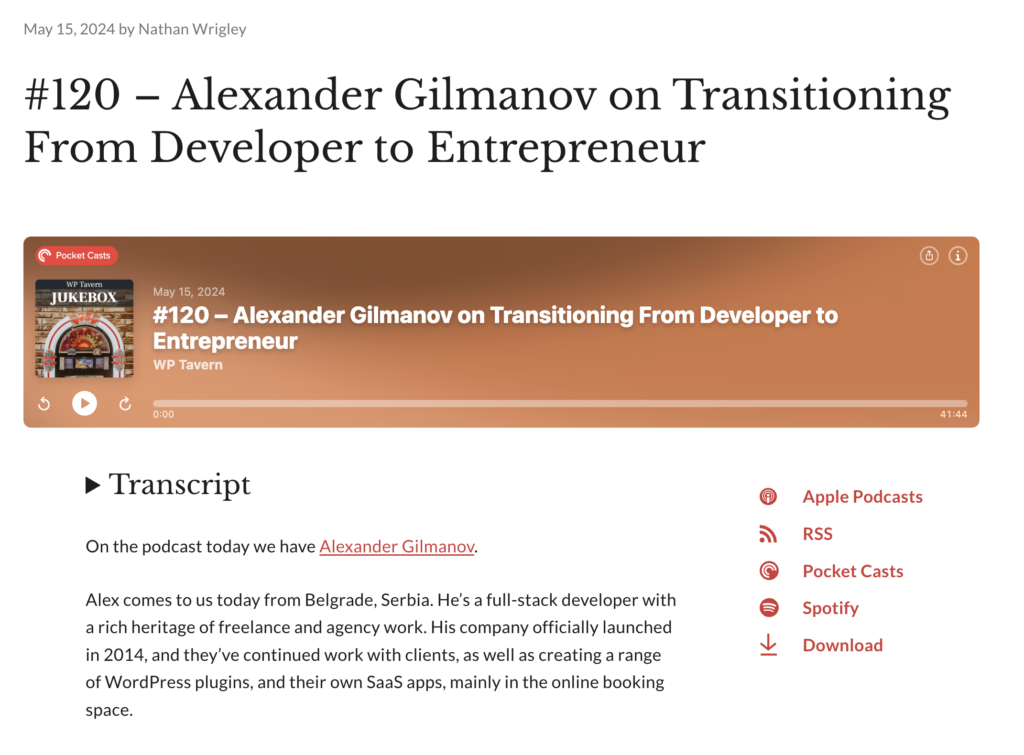 July 15, 2025 Seehawk Media - WP Legends Podcast WP Legends Episode #45 – Alexander Gilmanov on WordPress and SaaS products Watch podcast MEDIA February 12, 2025 WPFounders interview Interview with the WPFounders team Read interview April 16, 2024 OpenChannels.fm #479 #479 – From a Full Stack Developer to a WordPress Product Developer Listen to podcast October 8, 2025 Seehawk Media - WP Legends Podcast WP Legends Episode #45 – Alexander Gilmanov on WordPress and SaaS products Watch podcast May 15, 2024 WP Tavern Jukebox Podcast #120 – Alexander Gilmanov on Transitioning From Developer to Enterpreneur Listen to podcast Aug 9, 2019 WPCrib Interview A company that is behind 2 well-known WordPress plugins – wpDataTables and Amelia. Find out more about how these products were built in this interview. Watch interview